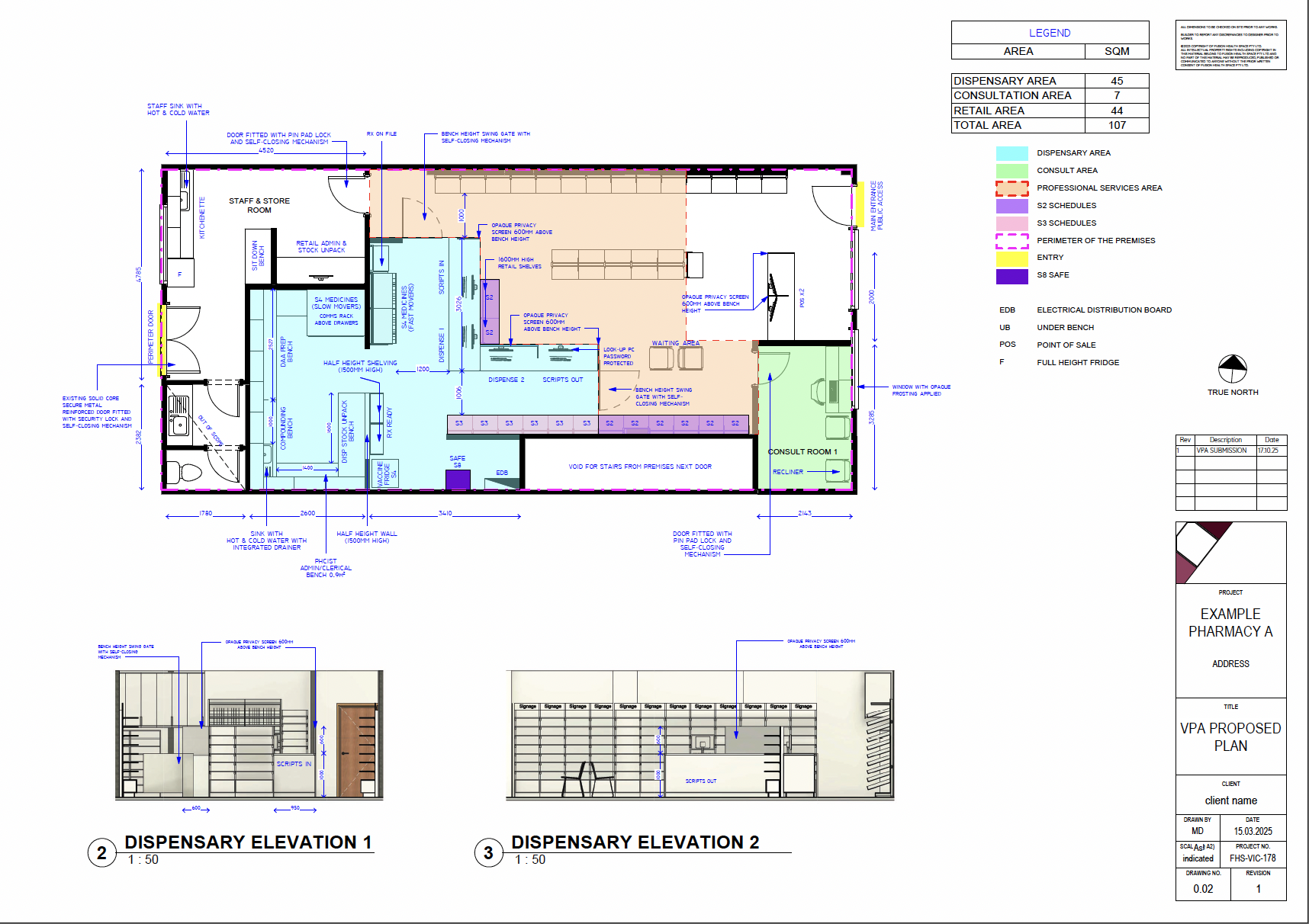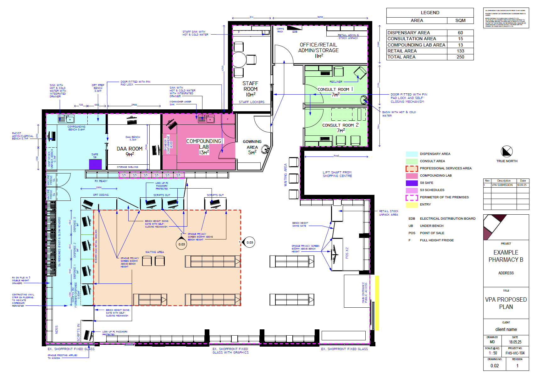 The VPA has published four sample floor plans. The sample plans give a visual representation of the elements VPA requires to be satisfied that the premises are suitable for the provision of pharmacy services and comply with the Act, the Schedule and the VPA Standards.